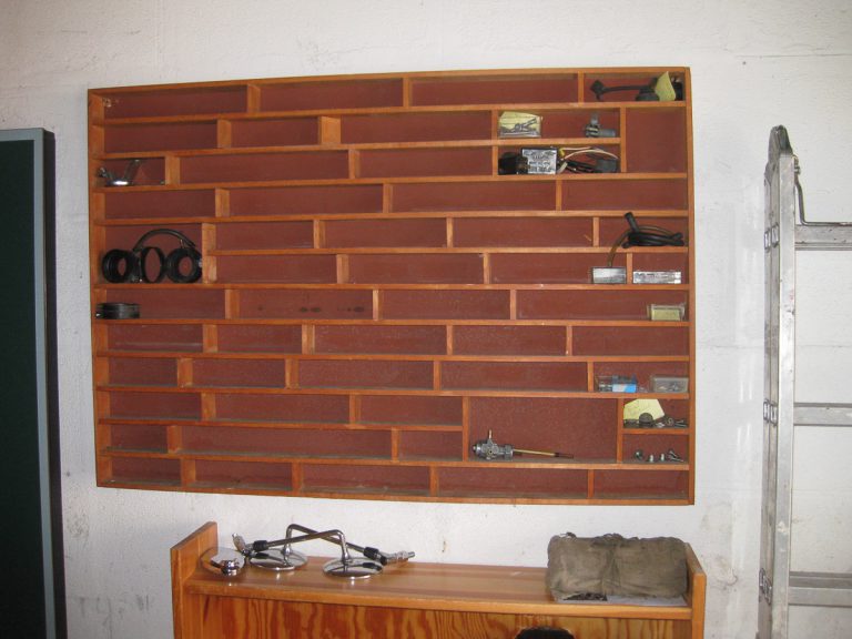 In der Garage sammeln sich nun die Teile. Um einen Überblick bei den ganzen Kleinteilen zu behalten, habe ich mir einen alten Setzkasten aus Wiking-Modell-Zeiten aufgehängt. Schrauben, Kleinstteile, Gummiteile etc. werden im Zusammenhang fotografiert und kommen alle in beschriftete Behältnisse. Sehr hilfreich!