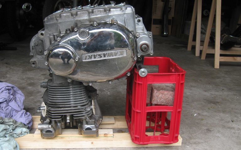 Der Motor der Kawasaki Z750 ist von außen einigermaßen gereinigt, so dass ich ihn mal über Kopf nehmen kann. Ein paar Latten,