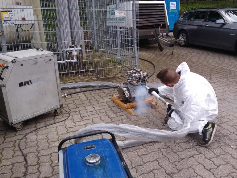 Aber nicht so aggressiv, im Ergebnis deutlich schwächer, aber auch ungefährlicher ist Trockeneisstrahlen, da das