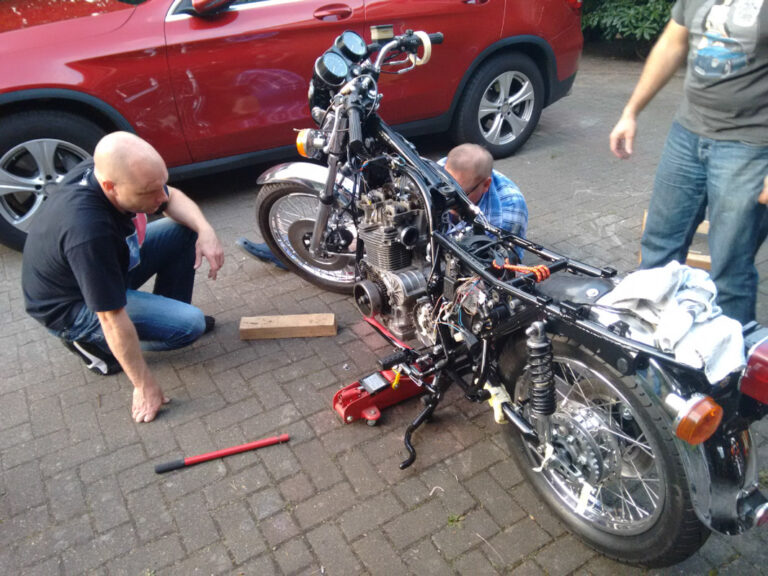 Tage nach dem Ausbau kommt heute der Motor wieder in den Rahmen. Vor Wurst, Steak und Bier müssen alle